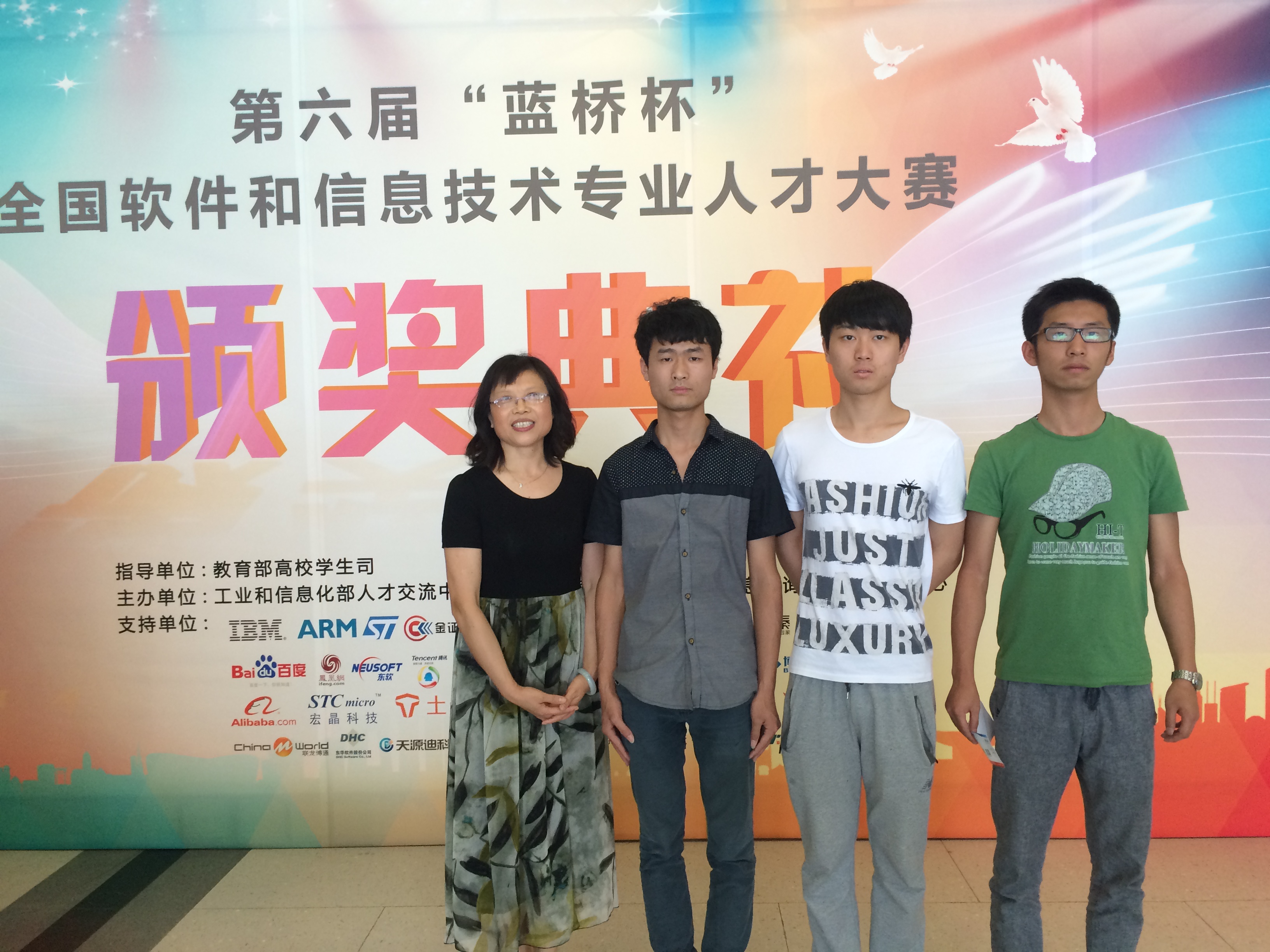 今年4月,我院信息工程系组织了13软件班6名同学参加了第六届“蓝桥杯”全国软件专业人才设计与创业大赛安徽省初赛,获得了3个一等奖、1个二等奖和2个三等奖的好成绩。其中获得省一等奖的李晨龙、陈志伟、韩航同学在信息系陈久娅、王光亚老师的带领下赴北京科技大学参加了5月30日的全国总决赛。经过与全国各地上百所兄弟院校学生的激烈的比拼,我院三名同学展现出较好的综合素质,分别荣获全国一、二、三等奖,其中,李晨龙同学获得该项目安徽省参赛院校唯一的一等奖,我院该项目比赛的总成绩排在安徽省参赛院校第一!(稿件来源:信息工程系)