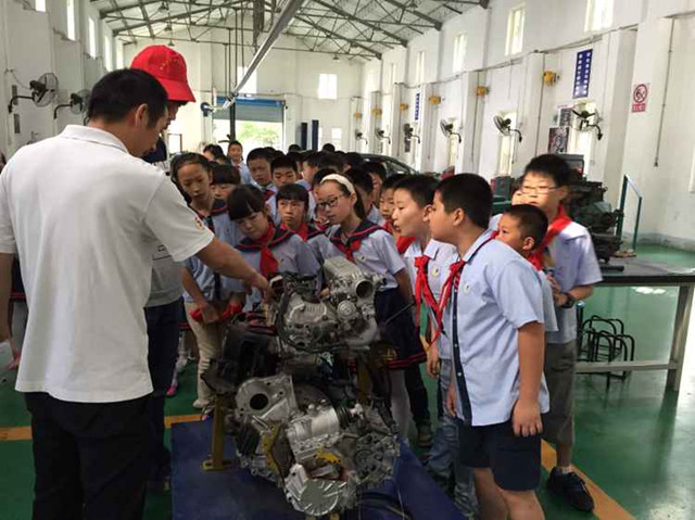 在学院机械工程系的大力支持下,此次活动共开放了5间实训室供小学生参观学习。在汽车教研室朱永宏主任的带领下,小学生们先后参观了“汽车电子控制技术实训室”、“汽车底盘实训室”和“整车维修实训室”。“是谁发明了轮子”、“是什么掀起了动力与速度的革命?”、“汽车动力”经历过怎样的速度和激情?小学生们带着这样的疑问来到实训室寻找答案。在朱主任的耐心讲解下同学们露出了开心的笑容。参观完了汽车实训室,小学生们还来到了“数控与模具实训室”。学生们围在实训车床旁,认真的听着程启森主任讲解机床的构件、原理及操作方法。当演示中机床发出声响运作时,学生们都非常的兴奋,个个张大嘴巴,瞪大眼睛,还不时的发出“哇”、“哇”的惊叹声。