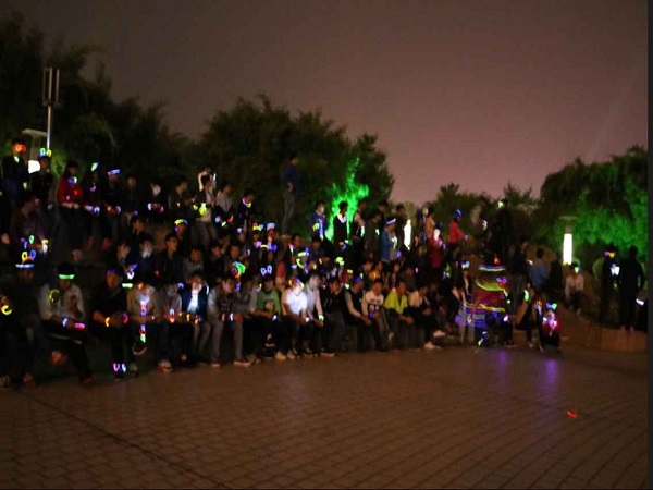 晚秋的夜风带来丝丝的凉意,但丝毫不影响夜跑同学们的热情。本次活动吸引了共300余名学生的参与。夜跑开始前,学生们在体育馆前集合,领取荧光棒、荧光手环、荧光贴纸、彩绘荧光T恤等物品,通过各种方式来装扮自己。