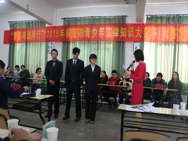 11月4日,由团市委、市委宣传部、市委政法委、市司法局、市教育局、市依法治市办公室和市广播电视台共同举办的“青春与法同行”2015年铜陵市青少年法律知识电视大奖赛A组复赛在我院举行。本次比赛共有市一中、市卫计委、狮子山区、国网铜陵供电公司、市十二中、铜化集团公司、安工学院共7支代表队参加。
