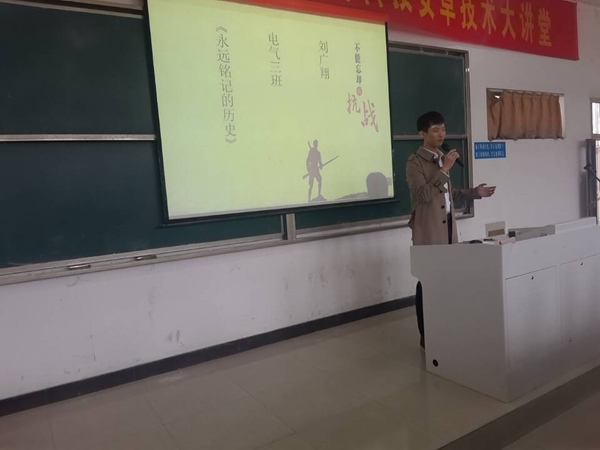 活动自今年10月份启动以来,经过各系选拔,最终17名选手脱颖而出进入决赛。决赛现场,选手们个个精神饱满、声情并茂、慷慨激昂,痛斥了当年法西斯列强的滔天罪行,赞颂了中国人民不屈不挠反抗侵略的英雄事迹,歌颂了中国共产党在抗战中取得的丰功伟绩,弘扬了在抗战中孕育出的伟大民族精神。并结合自己的理想与追求,在演讲中讲述如何牢记历史,把抗战英雄保家卫国、浴血奋战的战斗精神传承下去。通过演讲活动,大家抒发了热爱祖国的真挚情感,同时也让现场观看演讲的师生们受到了一次生动的爱国主义教育。选手们精湛的演讲技巧和真挚的情感流露,不时赢得大家的阵阵掌声。