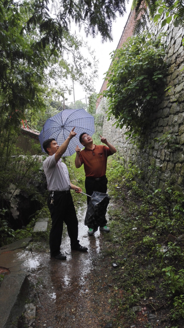 学院党委书记石小河与总务处负责人在北校区查看挡土墙情况