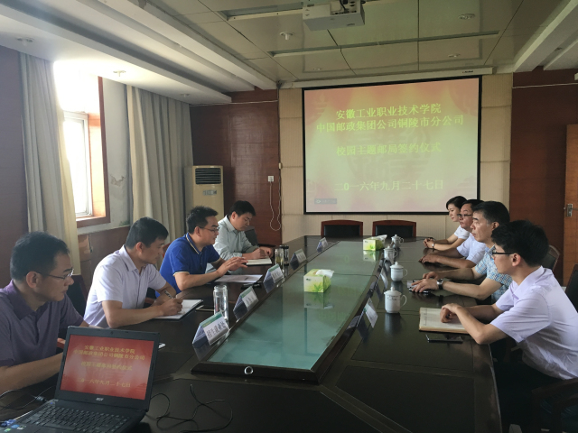 会议上,学院院长陈世虎与铜陵市邮政局局长金小胜就如何推进现有的合作项目、进一步加强未来的合作深入交换了意见,达成了共识。签约仪式后,金局长一行参观了校园,对项目所在地点进行了实地考察。