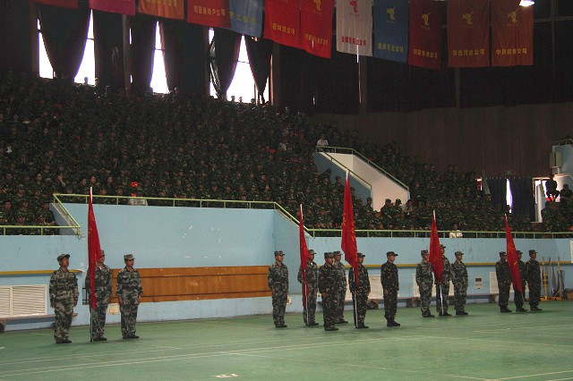 学院党委书记石小河代表学校向负责本次军训的武警支队教官授予了军训旗。