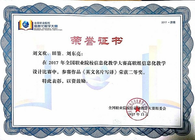 为深入实施教育规划纲要,贯彻落实《国务院关于加快发展现代化职业教育的决定》和《教育信息化“十三五”规划》,以信息技术推动职业教育教学改革创新,促进信息技术与课程教学的深度融合,提高教师教育技术应用能力和信息化教学水平,国家教育部于2017年11月24至27日在山东省济南市举办了2017年全国职业院校信息化教学大赛决赛。我院刘文欢、田鉴、刘东亮老师团队的作品《小卡片、大智慧——英文名片写译》获得全国高职组信息化教学设计二等奖。