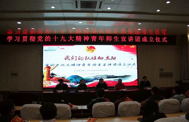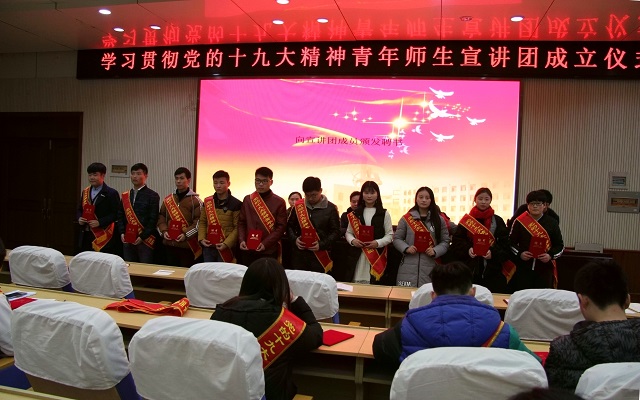 12月15日下午,学院举办了热烈的“学习贯彻党的十九大精神青年师生宣讲团”成立仪式。成立仪式上,学院党委领导向宣讲团成员颁发了宣讲员聘书,校学生会主席陈玉同学代表全体宣讲团成员做了表态发言,他表示将进一步增强学习的积极性和主动性,力求学早、学通、学透、学精,把握精神实质,做到了然于胸,原原本本、生动活泼地宣讲好十九大精神。学院党委书记石小河出席会议并做了动员讲话。他就宣讲团如何做好宣讲工作和青年学生如何在新时代健康成长成才向在场近200名大学生做了一场精彩的“微党课”。他希望广大青年学生用习近平新时代中国特色社会主义思想武装头脑,坚持读原著、学原文、悟原理,做到学深悟透。要不忘初心,牢记青年的光荣使命,做社会主义合格的建设者和接班人。