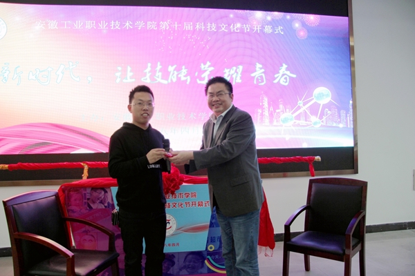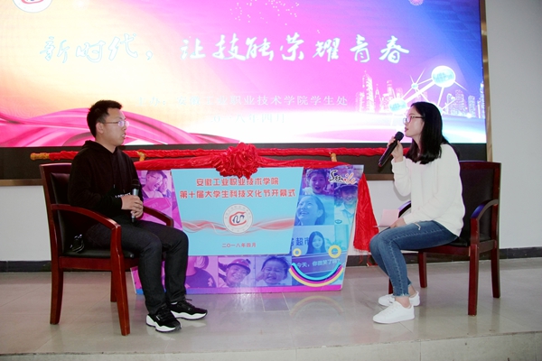 开幕式上,一段由我院优秀校友参与拍制的大学生科技文化节代言人宣传片《新时代,让技能荣耀青春》记录了我院学子的成长经历和路程,饱含了他们对学院的祝福、对学弟学妹的激励。现场还邀请到我院2011届杰出校友代表、马鞍山李龙测绘有限公司总经理李龙,接受面对面访谈。