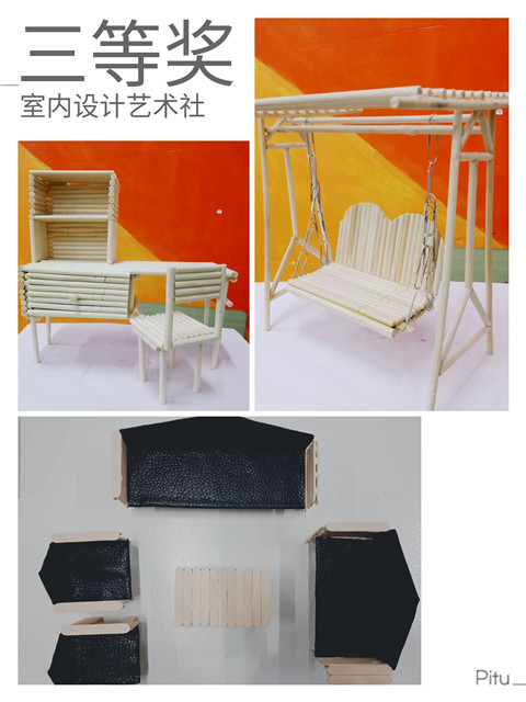 本次比赛以 “变废为宝,化腐朽为神奇”为主题,以绿色环保为主,让学生们自行发挥想象,制作软装作品。其中,制作作品的主要材料多以一次性筷子、冰棍、纸杯、饮料瓶等这些随处可见的废品为主。学生们大胆设想,独具创意的作品,让评委们眼前一亮。