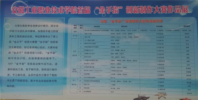 为培养学生创新意识,激发创新制作潜能,从去年9月开始,学院组织开展了第三届“金点子”创意大赛暨首届“金手指”创新制作大赛活动。全院学生积极响应,共收到“金点子”创意项目153项,“金手指”制作项目47项。经过专家初审,直立悬挂式密排旋转型自行车停放装置、液压力臂、LED埃菲尔铁塔、四轴飞行器等19件“金手指”项目在指导教师和参赛学生的共同努力下于4月底完成了制作,并获得参展资格。