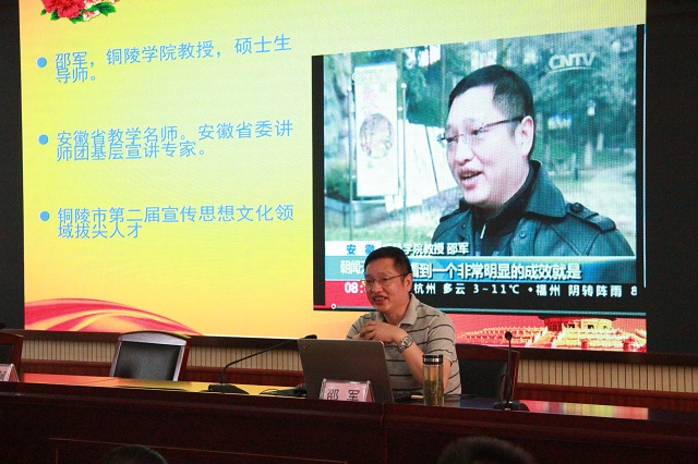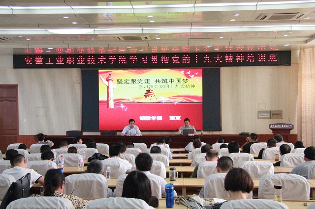 为深入学习宣传贯彻党的十九大精神,学院连续举办两期十九大精神培训班,对全院党员教职工进行集中培训。6月7日,学院邀请铜陵学院邵军教授作题为《坚定跟党走,共筑中国梦》的辅导报告。