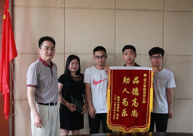 6月13日,建安小学一名家长来到安工学院向我院电气工程系“亮亮社团”的学生送来了写有“助人为乐 品德高尚”锦旗一面,感谢我院学生帮助其找到离家出走的儿子。