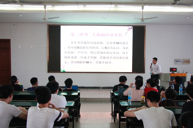 比赛以“学习经典诗词、诵读经典诗词、感悟经典诗词”为主题,得到了广大师生的积极响应,从6月初开始,经过各系层层推选,最终每系三名选手组成的五支代表队进入决赛。比赛在机械工程系雷涛同学优美的二胡演奏《白月光》的琴声中拉开了帷幕。比赛分为团队口号展示,选择题,团队合作题,抢答题,风险题五个环节组成。比赛中,参赛的选手们个个精神饱满,积极思考,沉着答题,展现出优秀的个人诗词能力和极高的团队配合力。压轴出场的抢答题也没有难倒各个选手,层出不穷的诗句从选手口中出现,难分高下,不分伯仲。