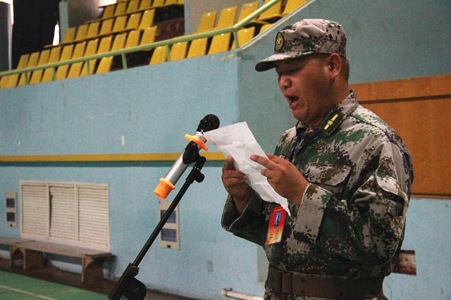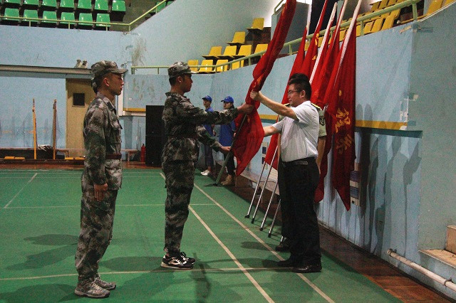 学院党委书记石小河代表学校向负责本次军训的武警支队教官授予了军训旗。