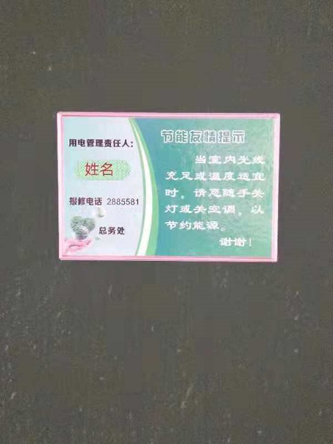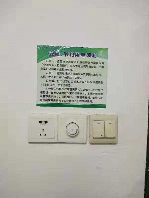 为实施《用电管理制度》,总务处将“安全、节约用电须知”和部门(单位)用电管理责任人名单张贴“上墙”,将责任细化到各系部、科室、及至个人,形成了责任具体、环环相扣的“节能责任链”,力争做到人人都参与到节约、环保的队伍中来,为共同营造一个节约型校园贡献一己之力。