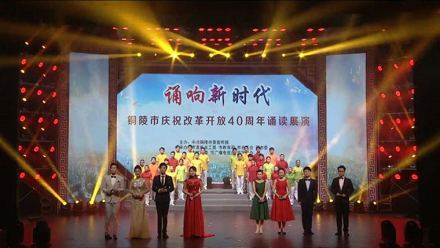 12月20日下午, “诵响新时代”铜陵市庆祝改革开放40周年诵读展演在五松山剧院举行,受活动方邀请,我院派出海子经典诗文诵读社团学生集体朗诵《再出发,我们第一棒》参加了本次演出,获得在场观众的热烈掌声。