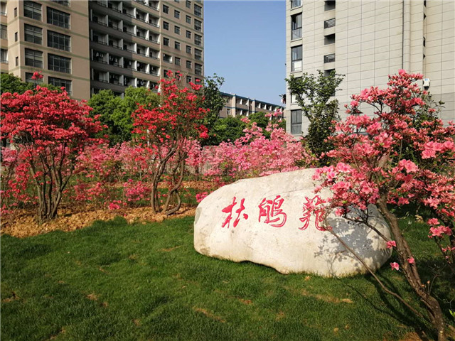 生活区中间绿化带分布着雍荣华贵的牡丹花。