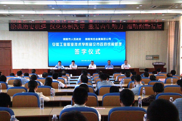 5月31日上午,学院移交市政府统筹管理签字仪式,在教学楼301学术报告厅举行。市委副书记、市长胡启生,市委常委、常务副市长程双林,铜陵有色公司党委副书记、总经理龚华东,党委委员、副总经理徐五七等有关领导出席,学院领导班子成员、学院教职工代表和学生代表出席了仪式。