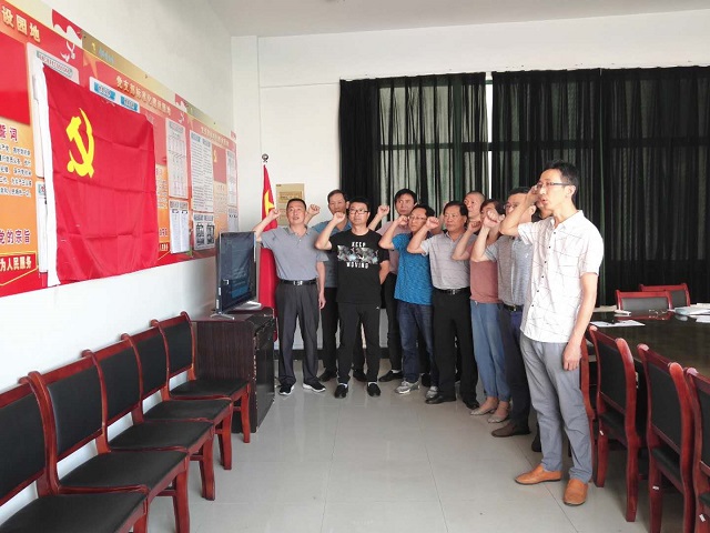 活动伊始,全体党员面对党旗,庄重宣誓,重温入党誓词,铭记入党初心,坚定理想信念。随后,党支部组织全体党员集中收看了“从党的一大到党的十八大”党史纪录片,回顾中国共产党不懈奋斗的光辉历程,亲历党的建设新的伟大工程,展望民族复兴伟业,使全体党员更加懂得“不忘初心,牢记使命”的责任,更加坚定“四个自信”、强化“四个意识”的自觉,更加坚决维护习近平总书记党中央的核心、全党的核心地位,更加坚决维护党中央权威和集中统一领导。