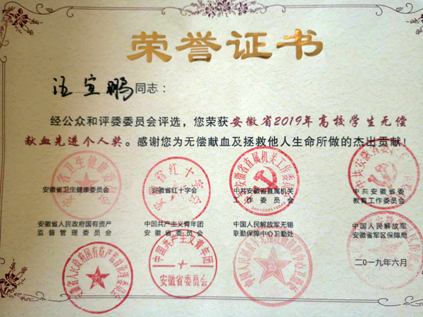 6月14日,2019年安徽省暨合肥市“世界献血者日”表彰会在安徽医科大学举行。会上,授予我院电气工程系学生汪宣鹏“安徽省2019年高校学生无偿献血先进个人奖”荣誉称号。