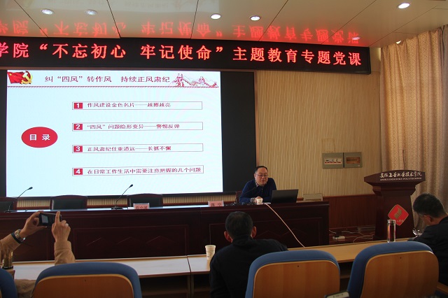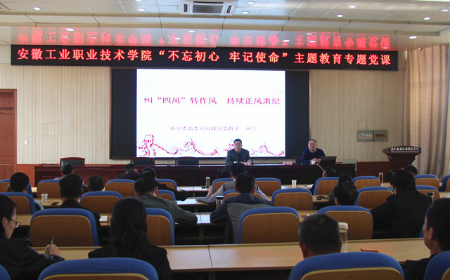 11月7日下午,按照“不忘初心、牢记使命”主题教育的工作安排,学院在天井湖校区阶梯教室301召开全体党员大会。会议由铜陵市纪委党风政风监督室主任蒋宁和学院党委书记石小河主讲,学院两级班子全体成员、全体教职工党员参加。