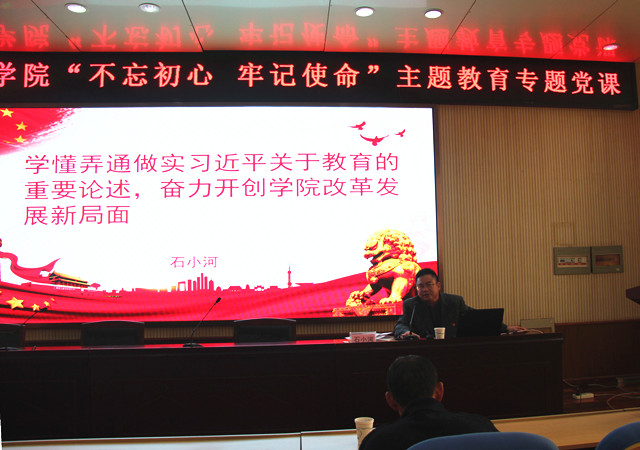 随后,学院党委书记石小河以《学懂弄通做实习近平关于教育的重要论述,奋力开创学院改革发展新局面》为题,从深刻把握习近平关于教育重要论述的精神实质和丰富内涵、用习近平关于教育的重要论述武装头脑,正确认识学院改革发展的机遇和挑战、以习近平关于教育的重要论述指导实践,奋力开创学院改革发展新局面等三个方面做了关于教育为国之大计、党之大计的讲授。石书记指出,党的十八大以来,我国职业教育发展取得了巨大成就,党的大政方针为我国新时代职业教育和继续教育改革发展指明了方向,明确了任务。学院移交市政府统筹管理,作为安徽大江职业教育集团单位成员,办学体制发生了重大变革,这是学院发展史上具有里程碑意义的转折,对学院平稳健康发展具有重要的历史意义,全院上下要坚持党的领导,统一思想,认真学习,提高政治站位,明确工作思路,紧紧围绕立德树人根本任务,锐意进取,奋力推动学院事业稳步发展。