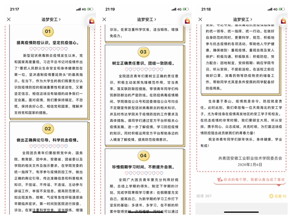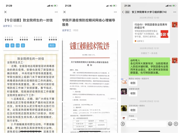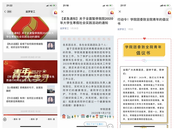 工作调整有速度。鉴于新型冠状病毒疫情的形势,对寒假相关工作安排做出调整。1月27日,印发《关于全面暂停我院2020年大学生寒假社会实践活动的通知》,明确要求全体学生,立即暂停寒假社会实践活动,确保师生健康安全,消除潜在的病毒传播隐患,开学后通过日常实践补充相关工作,保证学生学分资源。2月6日,发出《行动令!学院团委致全院青年的倡议书》,引导我院学生正确对待当前疫情形势,坚定抗疫信心,做到顾大局,听安排、不恐慌、不轻视。