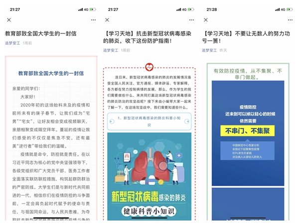 宣传发声有高度。面对网络信息纷繁复杂的现象,院团委充分发挥团学组织新媒体平台建设优势,将传递学院党政的正能量、树立抗“疫”的青年典型、关注学子对疫情的舆论等作为重点工作,将团员青年的思想引领做在网上,做在第一时间,做进青年学生心里,凝聚共识,坚定信心。一是通过学院团委官方微信公众号第一时间向学生传达学院关于疫情防控的相关精神;二是开展青年大学习—疫情防控知识专题宣传,每日推送新华社、人民日报等权威官方媒体及各级党委、政府关于疫情防控的信息和科普知识,做好疫情防控知识宣传教育,引导青年学生了解疫情传播途径、防治办法,切实增强自我防护意识和自我保护能力,做到科学防控,不信谣、不传谣;三是开展疫情防控网上宣誓活动,号召青年学生积极配合所在地党委、政府和防控中心的防疫工作,并发出网上誓言,院团委择优在微信公众平台刊发,营造众志成城抗击疫情的舆论氛围。