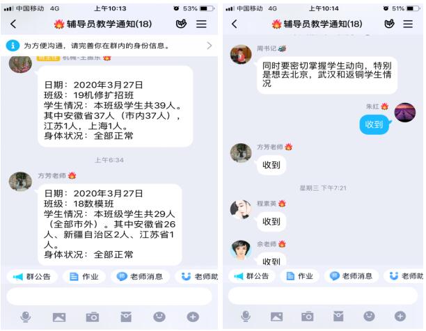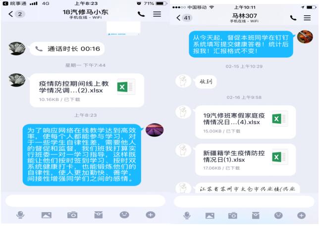在疫情阻击战关键时刻,辅导员们24小时不关机,他们利用手机、QQ、微信、钉钉系统,从早上6点左右开始,一直忙到凌晨,更新信息,对每位学生健康体温“一日三问”,对个别重点学生“一日几问“,并绘制动态路线图。各班辅导员及时摸排学生情况并积极汇报系部,为缓解个别家庭因疫情引发的经济窘境,及时汇报并发放36名建档立卡学生的国家补助金72000元。辅导员们每天从学生的学习生活到心理咨询,从上课出勤到点滴细节,逐一过问。学生们在班级群里时常听到辅导员们的语音留言,感受到辅导员们温暖的关爱,每天辅导员们发出的指令短信多达数百条,他们用真情传递大爱,奉献诠释职责,顾大局讲政治,精准防控,守好自身责任田。(稿件来源:机械工程系)