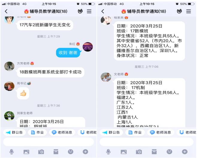 机械系共有567名学子,其中12名新疆籍学生,17级在外顶岗实习学生237人,19级社会扩招学生147人。他们遍布全国各地,地域广散,人员复杂,情况告急!系部迅速发出第一号战令:各带班辅导员必须第一时间联系、排查学生健康状况及居留地精准方位,并每日动态更新。疫情战斗打响后,辅导员们每天通过电话、QQ群公告栏、班级微信群、短信群发,滚动传送,并召开云班会传达学院系部发出的一道道指令,为打赢疫情阻击战役奠定了坚实的基础。