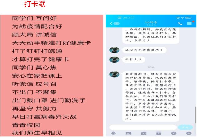 根据省教育厅统一防控的要求,全体师生自2月15日起,要求每日在钉钉系统填写健康答卷。根据铜陵市教体局要求,3月6日起,全体师生要在皖事通报告健康状况。面对新情况,辅导员们常一起在群里互相交流经验到深夜。每天督促学生二套系统双打卡,对辅导员体能与耐心都是极大的挑战,为了调动学生打卡积极性,确保精准完成双打卡,专职辅导员张庆宏冲当起打卡急先锋,用自编打卡歌,猜谜语的方式,开展寓庄寓谐、寓教寓乐的活动,极大地调动学生打卡参与的积极性,所带班级学生每天早上8点前双打卡率100%,他推广的经验引发了一批无敌打卡班,打卡冠军班,机械系整体打卡率在学院遥遥领先。