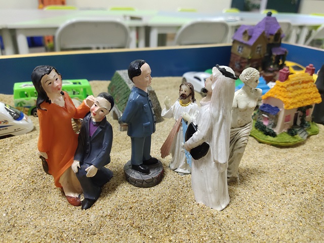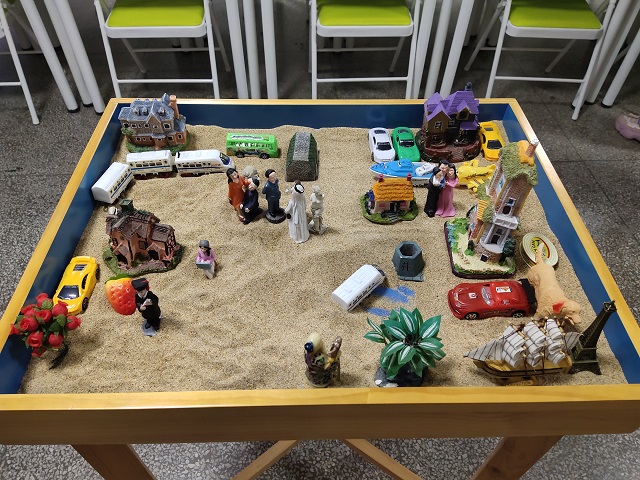 在沙盘创作阶段,每位同学带着强烈的自我探索和寻求帮助的意识参与本次活动。一进入活动室,他们就立刻被琳琅满目的沙盘玩具所吸引,表现出对沙盘游戏浓厚的兴趣。沈老师为大家介绍了沙盘的理念和团体沙盘规则后,大家便按照沙盘规则开始进入沙盘创作,整个过程不允许成员间有任何言语交流。