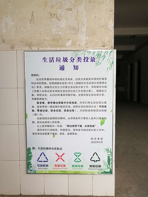 今年6月1日,《铜陵市生活垃圾分类管理条例》正式施行,标志着铜陵市垃圾分类进入强制时代。为做好学院生活垃圾分类工作,近日,学院开展了一系列“生活垃圾分类”宣传推广活动: