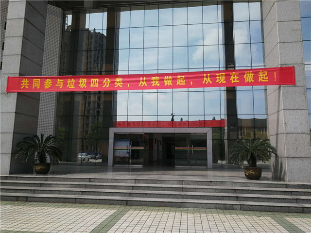 悬挂宣传横幅,设置宣传展板,宣传垃圾分类知识,树立垃圾分类意识。