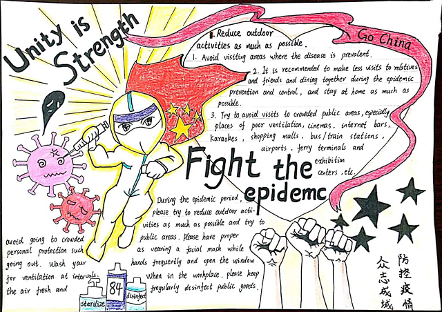 新冠肺炎疫情的突袭让2020年春天注定成为中华民族史册上难以忘却的一页。寻找“最美战疫人”艺术作品活动和“青春有我 战疫同行”英语手抄报评比两项创新实践活动围绕“从疫情中学习什么”这一问题,引导同学们学会敬畏自然、增强健康生活能力和理性分析能力,增强大局意识、永葆家国情怀、与国家城市同向同行,以实际行动践行报国之志。