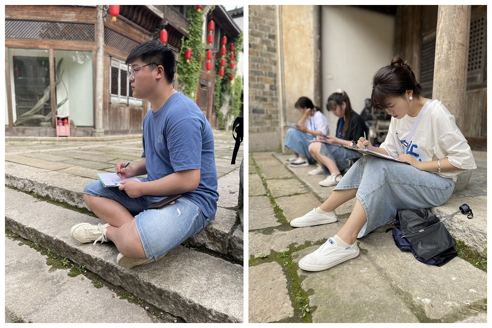 活动中,大家在景区工作人员的引导下,先后参观了古钱币馆、陶艺馆、竹编馆、根雕艺术馆、古战射箭场、汉服馆、扎染坊等主题展馆。景区研学老师还带领大家参观了当地特色的徽派建筑,细致地讲解了该建筑的特点、构成要素等,并通过现场解答的方式,加深和巩固了学生对建筑工程技术理论知识的理解和掌握,填补课本以外的空缺。 同学们边听边记,有的直接拿起画笔和画板把这一幢幢粉砖黛瓦细致地画下来。