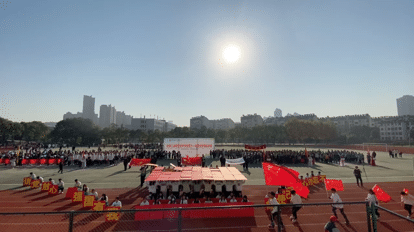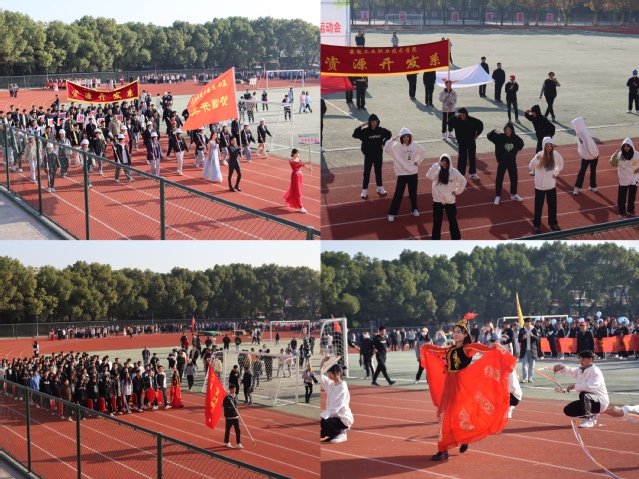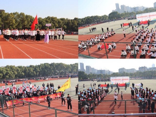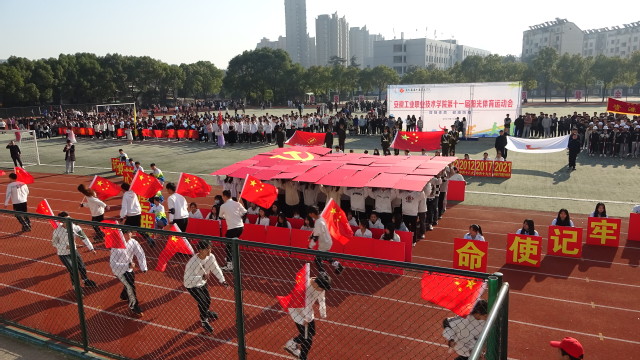 在庄严的国歌声中,大会正式拉开帷幕。国旗、校旗、会旗方阵,学院各院系运动员代表方阵,有色技师学院代表方阵,铜陵技师学院(天井湖校区)代表方阵,教职工代表方阵,青年志愿者方阵,庆祝建党百年表演方阵依次列队入场。国旗、校旗、会旗方阵步伐整齐、各院系代表方阵身着各具特色的服饰,面带笑容,喊着口号,昂首阔步,神采飞扬,在主席台下进行了富有院系特色的创意表演:有炫丽夺目的个人才艺表演、有动感活泼的现代舞、还有独具异域风情的新疆舞等。现场精彩纷呈,掌声不断。庆祝建党百年表演方阵带来了表演《红船精神》,精彩的表演把开幕式推向高潮,同学们用丰富的想像力尽情演绎党的百年征程,充分表达了对党、对学校未来的美好祝福。