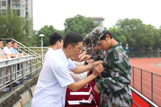 在表彰仪式上,学院副院长周庆华宣读《关于表彰2025及新生军训先进集体和优秀学员的决定》,与会领导为先进集体代表颁发荣誉证书,并为新生代表授予校徽。
