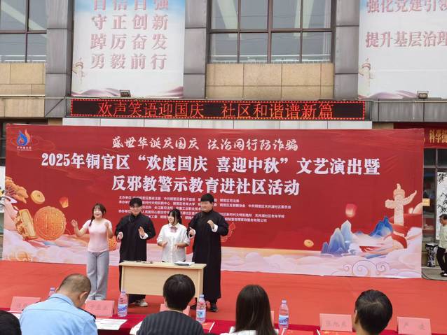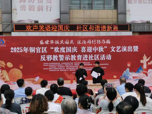 9月28日上午,天井湖社区党群服务中心广场人潮涌动,一场以“盛世华诞庆国庆 法治同行防诈骗”为主题的迎国庆暨反邪教警示教育文艺汇演在此火热上演。由安徽工业职业技术学院青曦话剧社精心打造的原创反电诈群口相声《校园反诈修炼手册》,凭借贴近现实的题材、幽默生动的演绎,成为全场焦点,赢得观众阵阵喝彩,为构建校园安全“防火墙”注入青春活力。以青春之名,担时代之责。安徽工业职业技术学院青曦话剧社用一场精彩的演出,诠释了新时代青年的智慧与担当,为共建平安社会交出了一份亮眼的青春答卷。