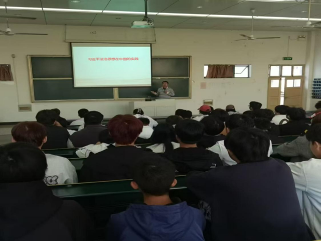 为提升同学们法治思维和法律意识,助力新时代中国法治建设,贯彻落实全国人大常委会2025年9月颁布的新时代《法治宣传教育法》,10月24日下午,基础部在学院教学楼阶梯202教室举办“习近平法治思想在中国的实践”专题讲座,讲座邀请基础部孙彪老师作为主讲人,学院100余名学生参加学习。讲座围绕习近平法治思想的生成逻辑、鲜明特征、法治实践等三个方面展开。
