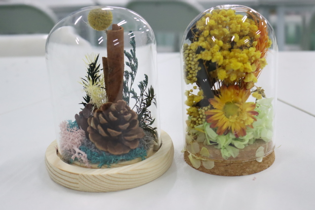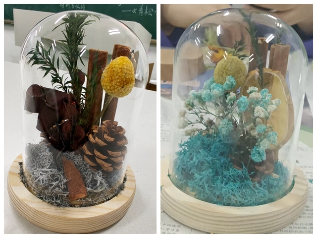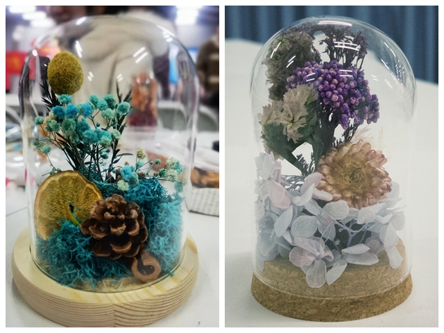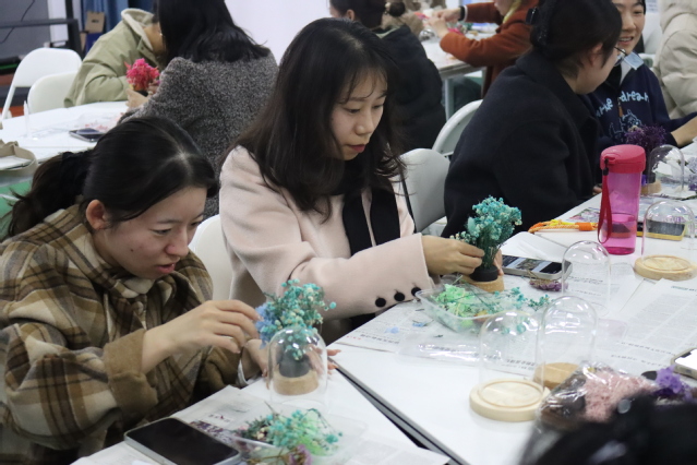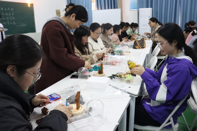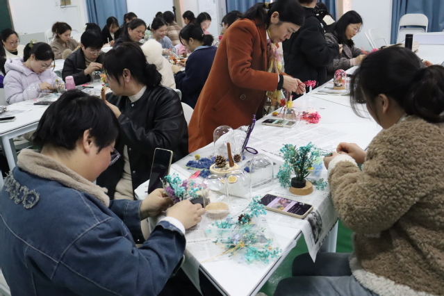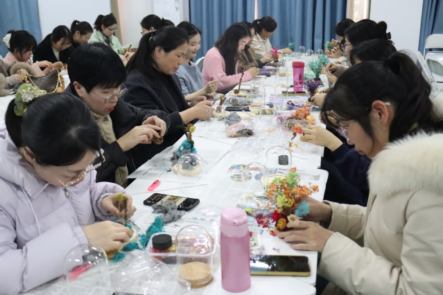 在“创意永生花DIY”制作环节,平日里忙碌于教学和管理的女教职工瞬间化身为巧手匠人,全心投入创作。大家精心挑选花材、构思布局,将一朵朵绚丽的永生花细心粘贴在玻璃摆件中,让永恒的美丽在指尖绽放。活动现场充满了欢声笑语,一个个独一无二、精致雅观的永生花作品陆续完成,大家互相欣赏、交流心得,成就感与喜悦感洋溢在每个人的脸上。