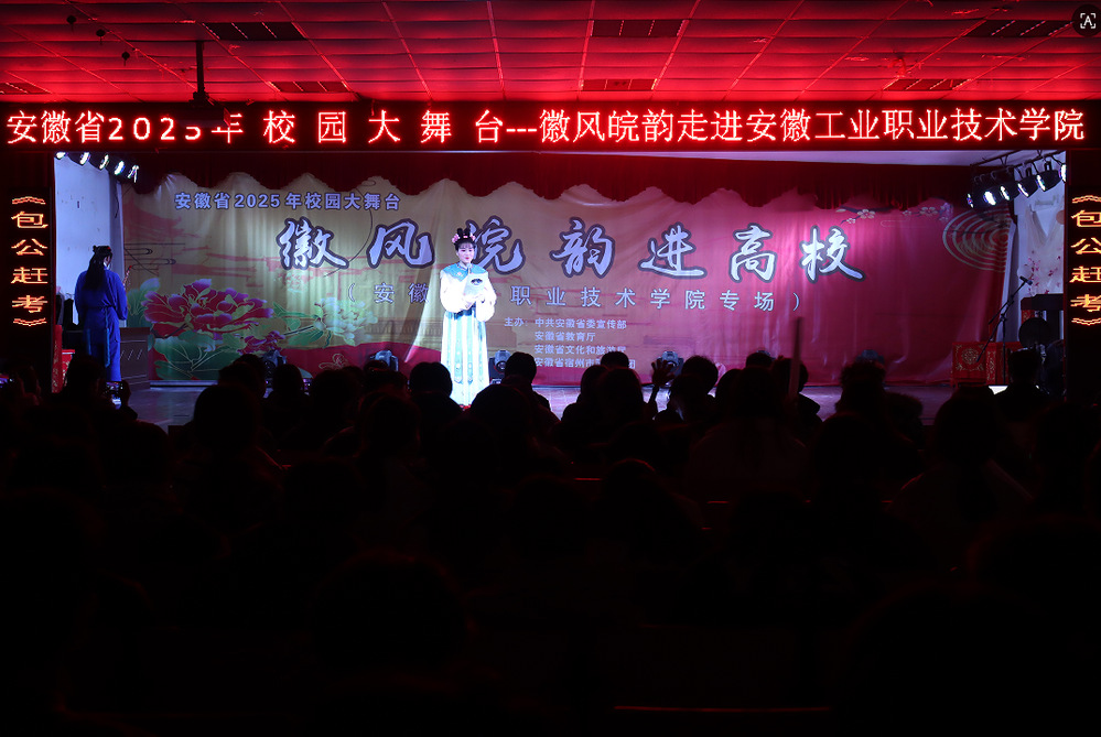 12月2日下午,学院迎来了一场别开生面的文化盛宴,2025年校园大舞台——“徽风皖韵进高校”专场演出活动。本次活动由中共安徽省委宣传部、安徽省教育厅、安徽省文化和旅游厅共同主办,宿州市坠子戏剧团和学院承办。学院党委书记范清义,党委委员、纪委书记罗海峰出席活动,学生处、团委、二级院系相关负责人及400余名师生代表观看了整场演出。