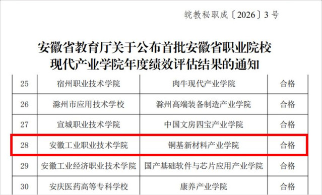 近日,安徽省教育厅公布了首批职业院校现代产业学院年度绩效评估结果,由我院与铜陵有色金属集团下属三家企业合作共建的“铜基新材料产业学院”顺利通过年度绩效评估。