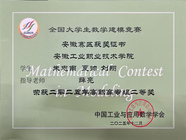 近日,2025年全国大学生数学建模竞赛安徽赛区获奖名单揭晓。由我院朱志南、夏帅、刘翔三位同学组成的参赛团队,在指导教师薛亮、庄红艳的精心指导下,凭借严谨的建模思路和出色的团队协作,荣获高职高专组二等奖,为学院争得荣誉。
