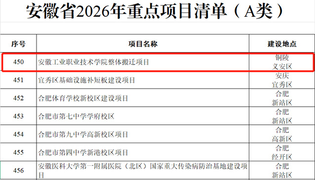 近日,安徽省人民政府发布《安徽省2026年重点项目清单》,其中“安徽工业职业技术学院整体搬迁项目”成功入选A类重点项目清单,建设地点位于铜陵市义安区。这标志着学院新校区建设正式纳入省级重点推进范畴,为学院高质量发展按下了“快进键”。