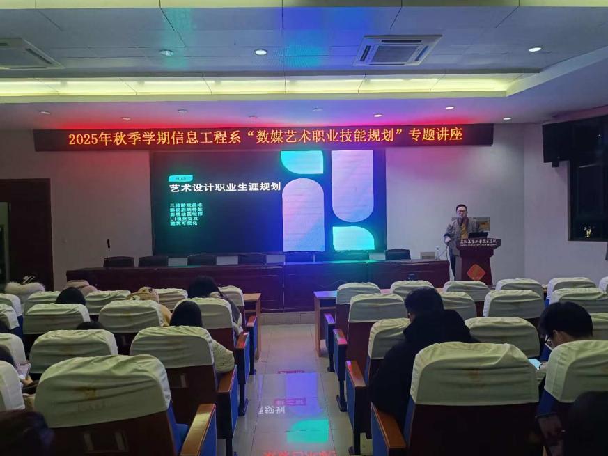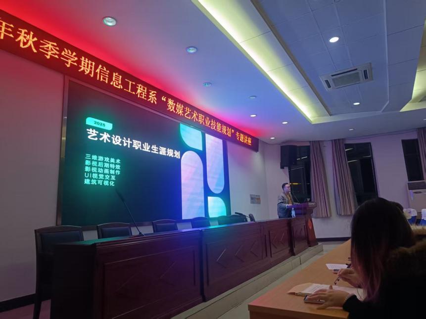 2025 年 11 月 24 日,信息工程系于阶梯教室 201 举办数媒艺术职业技能规划专题讲座。本次讲座特邀南京凰羽数字媒体产业有限公司顾志颖总经理担任主讲人,顾总凭借丰富的行业从业经验,围绕数媒艺术相关职业技能要求与就业发展前景,为在场师生带来了一场深入浅出、干货满满的分享。