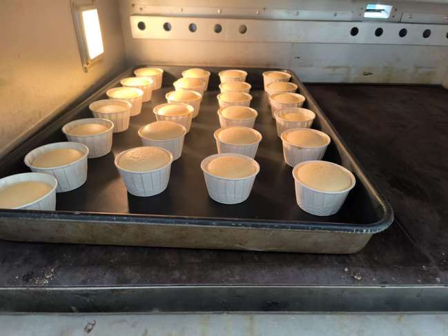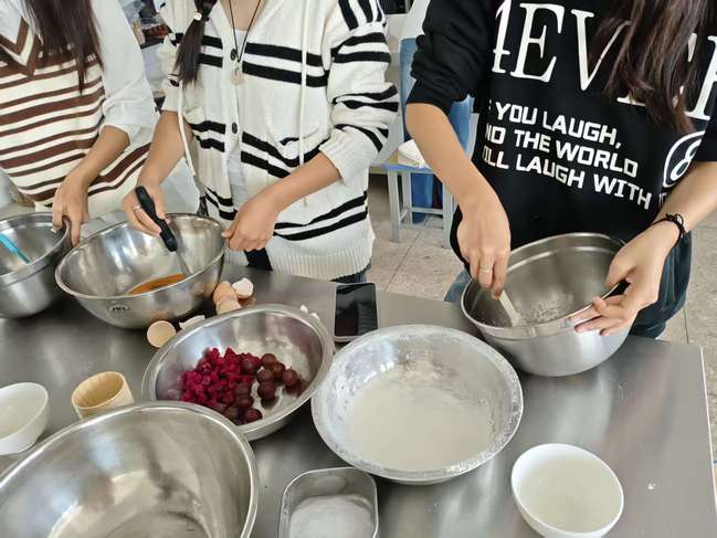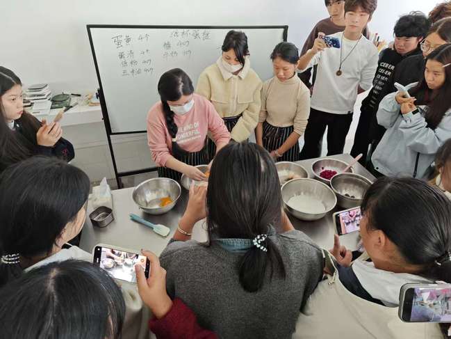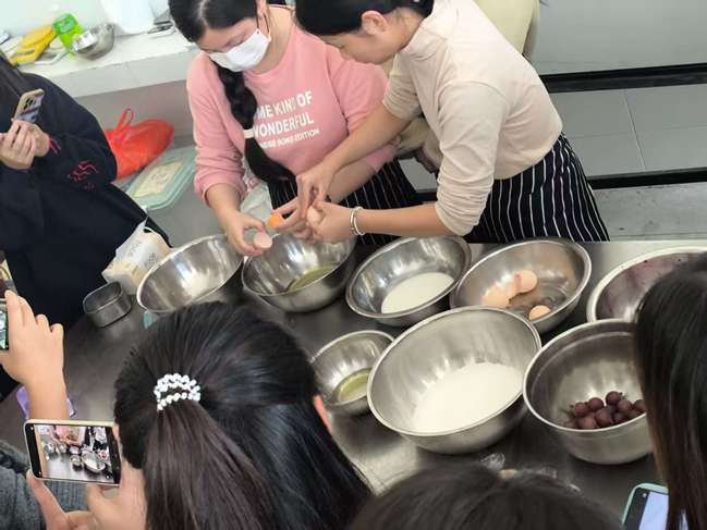 实践环节中,同学们迅速投入创作,分组协作完成每一道工序:小心分离蛋清蛋黄、细致搅拌蛋黄面糊、耐心打发蛋清至出现弯钩状,再将两者轻柔翻拌融合,最后将细腻的面糊注入纸杯至七分满。操作过程中,大家互相交流经验,主动向老师请教问题,原本略显生疏的手法在实践中逐渐熟练。
