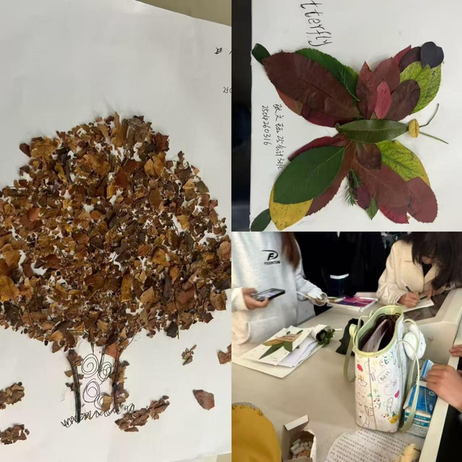 活动启动后,同学们热情高涨,纷纷走进校园的林荫道,收集形态各异的落叶。一片片普通的落叶,在同学们的手中逐渐焕发出新的生机。创作现场,同学们或独自构思,或三五成群交流想法,有的将落叶修剪成花瓣形状,拼贴成精美的花朵摆件;有的利用落叶的纹理,搭配彩笔勾勒,制作成独特的书签;还有的发挥空间想象力,将落叶与黏土、树枝等材料结合,打造出立体的场景作品。每一件作品都融入了同学们的创意与巧思,展现出大家对生活的热爱和对环保的理解。(撰稿人:杨文敏 审稿人:何靓)