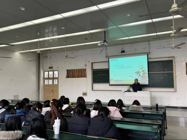 12月5日下午,由我系刘汉周老师主讲的“会计业务大讲堂——2026年会计职称考试”专题讲座在教学楼阶梯教室102顺利举行。24级会计1班、2班及财务班共80余名学生参加了本次讲座。