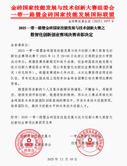 近日,2025一带一路暨金砖国家技能发展与技术创新大赛数智化创新创业赛项全国总决赛在浙江交通职业技术学院圆满落幕。来自我院管理工程系学生戚泽豪、牛宁、夏甜荣组成的参赛团队,荣获高职组全国总决赛三等奖。
