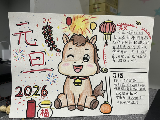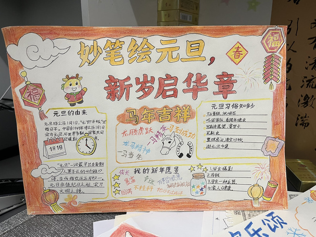 活动现场,同学们围绕“元旦”“新年”“希望”等主题,发挥创意与想象,将色彩、文字与排版巧妙结合。有的以喜庆的红色为主调,融入灯笼、烟花、春联等元素,传递浓浓的年味;有的以清新的蓝绿色调描绘春天的生机与希望;还有的通过引用诗词、撰写寄语,表达对新一年的憧憬与祝福。在创作过程中,大家互帮互学、交流心得,现场气氛热烈而温馨。